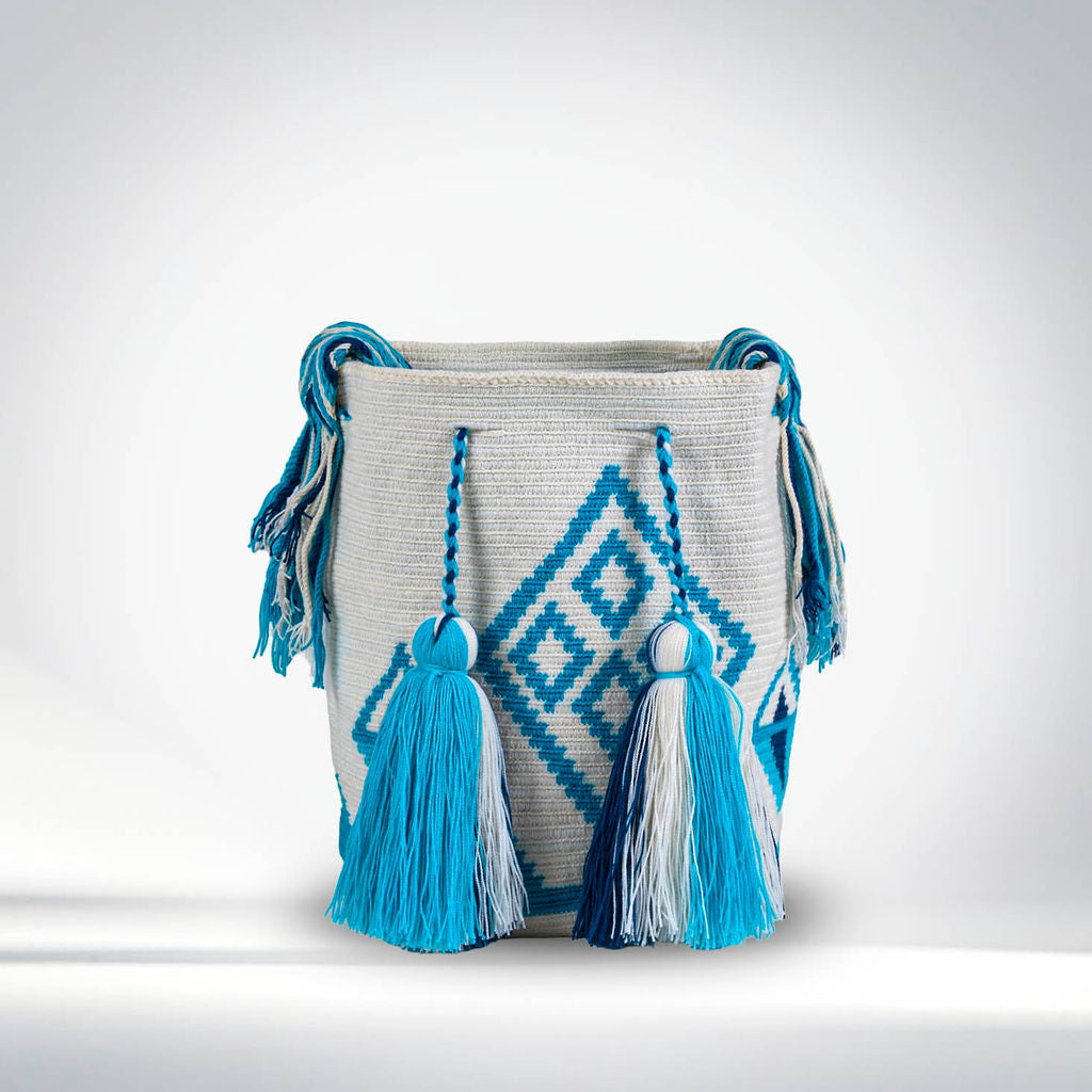 Inspirado en los majestuosos icebergs de la costa de Terranova, el bolso Wayuu "Iceberg Elegance" luce una base blanca nítida con patrones geométricos en azules gélidos y aguamarina. Los diseños reflejan las facetas del hielo brillando al sol. Las asas trenzadas en tonos fríos realzan la temática, y una borla con una cuenta de cristal transparente simboliza la pureza y la belleza natural.