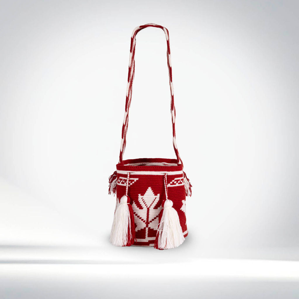 Un bolso Wayuu que fusiona la artesanía amazónica con un toque de orgullo canadiense. El bolso presenta un color base rojo intenso, con intrincados motivos de hojas de arce entretejidos con hilos blancos y dorados. El patrón, sutil pero reconocible, celebra el símbolo nacional de Canadá. Las asas están trenzadas con rayas rojas y blancas, y el bolso está rematado con una borla que incluye una pequeña hoja de arce bordada. Este diseño conecta la herencia canadiense con el arte amazónico, convirtiéndolo en una pieza única de fusión cultural.
